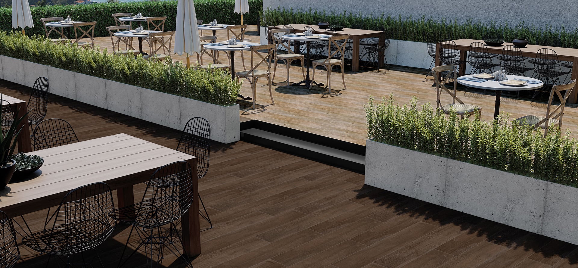 Meeting the hues of brown with the floor and walls, the Oakwood series resembles wood with the almost natural texture. The series presents the hygiene and durability advantages of porcelain.