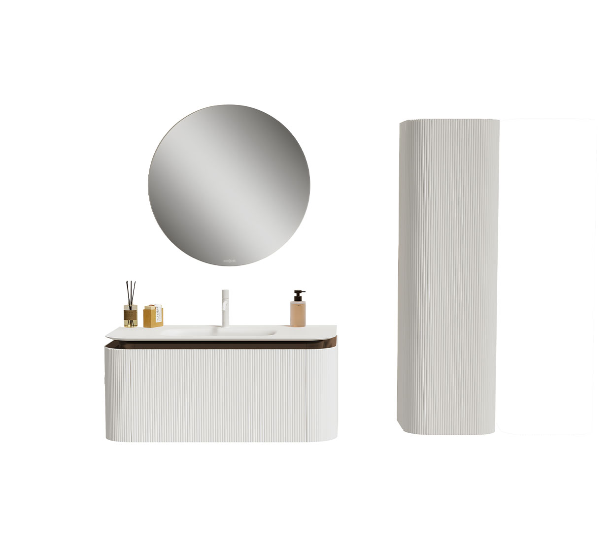 Includes back LED lighting and solid Mattte lacquered handles, an Acrylic Corian basin. Faucet and siphon are not included. *Features LED lighting, detailed solid Mattte lacquered handles, a soft-closing, full-extension drawer system, and a non-slip Matt inside the drawer.