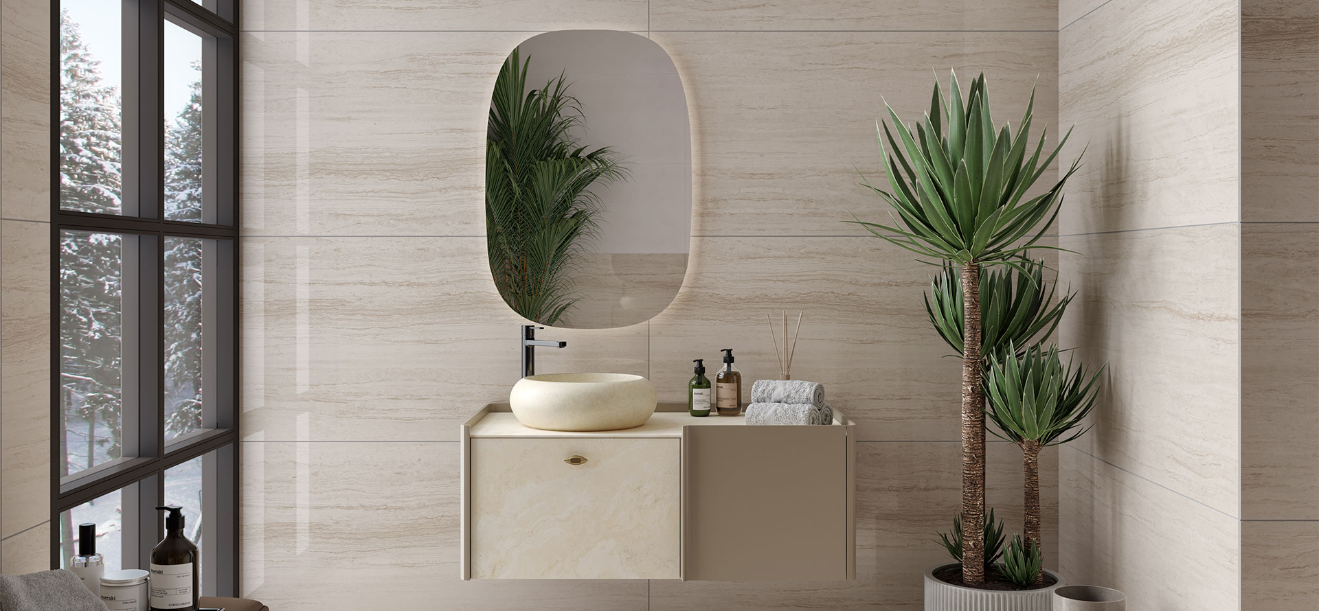 Stone Banyo Mobilyası, çakıl taşının doğadaki serbest ve akışkan formundan ilham alarak banyolarda yalın ama güçlü bir estetik sunuyor. Farklı dokular ve renk katmanlarıyla şekillenen yüzey yapısı, kuma dokusunu andıran özel dokusuyla öne çıkıyor. Lavabonun altında yer alan sensörlü gece ışığı, karanlıkta hem fonksiyonel hem estetik bir kullanım sunarken, lavabonun heykelsi formunu da vurguluyor. Ahşap kulp ve aydınlatmalı askı gibi tamamlayıcı detaylar ise tasarımın bütünlüğünü destekliyor. Stone, 60x120 cm ebatlarındaki Serpegiante serisi seramik karo ile buluştuğunda, beyaz tonlarındaki mermer dokusuyla zamansız bir şıklık sunuyor.